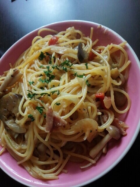 ベーコンときのこのオイルパスタ アヒージョのオイルで 2人分 味の兵四郎 ひょうしろう 公式通販サイト